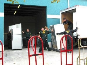Lee County Sheriff's deputies are shown loading stolen appliances on a truck earlier today. Some 180 appliances were stolen and four people have been charged. Photo by Mel Toadvine