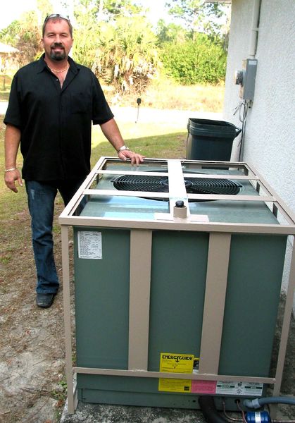 Barlow with cage: Chuck Barlow has invented a heavy steal cage that he says will keep thieves from stealing your air conditioning equipment. Here he stands in front of a cage he has just installed. Photo by Mel Toadvine