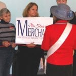 Sharon Merchant at Chamber: Sharon Merchant, center, who is running for State Senate, District 27, has joined the Lehigh Chamber of Commerce. Here she is shown with a political placard while former Honorary Mayor Marylou Land reads a proclamation in her honor. Looing on at left is Joan Starr, a member of the Lehigh Chamber. Photo by Blair Stitt