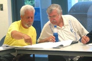 LACPC members Frank LaRosa, left, and Willard Baker, look over plans by Rudy Naranjo who wants to open up a produce and flower market on the corner of Homestead Rd. and Delaware Are. Photo by Mel toadvine