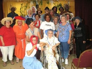This is the cast of the “Let’s Entertain Hillbilly Hatfield and McCoy Wedding” which performed April 29 at the Lehigh Acres Citizens Center. It was the occasion of the Senior Center’s Spring Barbecue. Shown from left to right, front row, pianist Sara Gillespy; great grandmother Agnes Gillespy. Lehigh Acres Senior Center Spring BBQ held Thursday, April 29 on Plaza Drive featured the Let’s Entertain Hillbilly Hatfield and McCoy Wedding. Cast members are from left to right, front row, Sara Gillespy, Agnes Gillespy. Second row, Sharon Howen, Don Thompson, Lucy Gucofski, Aura Wilson, Penny Phillips, Lillian Beauregard. Third row from left, Lenore DelCastillo, Terry Homen, Darrell Fratzk. Fourth row, from left, Ron Valentine, Jo Palmer, Ruby Thompson, Ann Simonton, Headley Wilson. Fifth row, from left, Chet Olson, Gladys Olivieri, Jim Simonton and Feliza Peruski. Photo by Joni Ferster