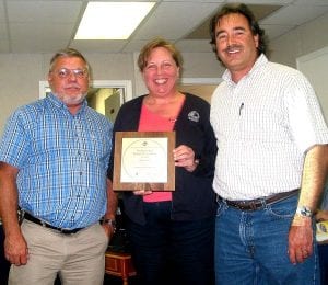 Horrom presents District award: Neal Horrom, right, chairman of the East County Water Control District’s board of commissioners, presents a Distinguished Budget Presentation award to ECWCD Comptroller Brenda Fallon, and at left, David Lindsay, ECWCD manager. The award was from Government Finance Officers Assoication and cited the good performance the administration for the fiscal year beginning Oct. 1, 2009 and was presented during the ECWCD’s regularly scheduled meeting on May 24. Photo by Mel Toadvine