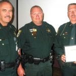 Deputy of the Month honored: The Lehigh Acres Chamber of Commerce honored Deputy Mike Dzuiba, right, as the Deputy of the Month. Also shown are Capt. Ed Tamayo, Bravo District commander, left, and Lt. J.D. Loethen, who told the Chamber of an act of kindness by Deputy Dzuiba. Photo by Mel Toadvine