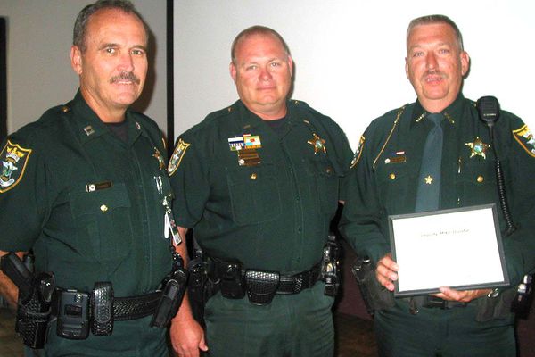 Lt. J.D. Loethen, an assistant commander at Bravo District in Lehigh, presented the award to Deputy Mike Dzuiba during the Chamber’s monthly luncheon on May 25. Also attending the luncheon was Capt. Ed Tamayo, Brava District commander.