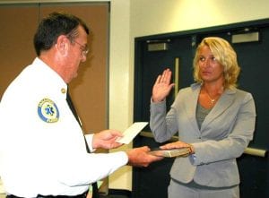 Swearing in at Fire Dept.: Chief Don Adams administers an oath of office to new Assistant Chief of Administration/EMs Diana A. Watson, who will oversee the EMT training of all the employees at the department. Photo by Mel Toadvine