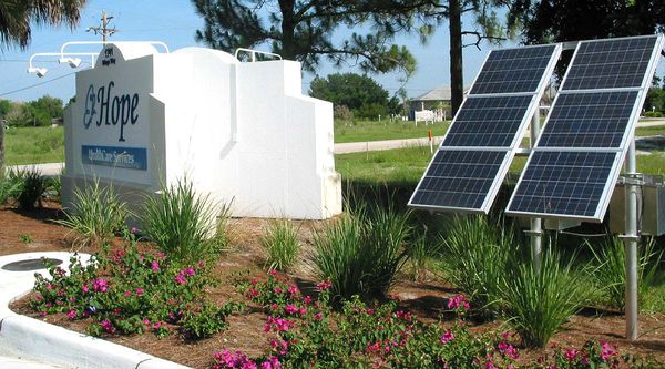 The two large signs, one marking the name of the Hope Hospice House and the other marking the addresses of other agencies on the new Wings Way, are being powered at night with solar energy.