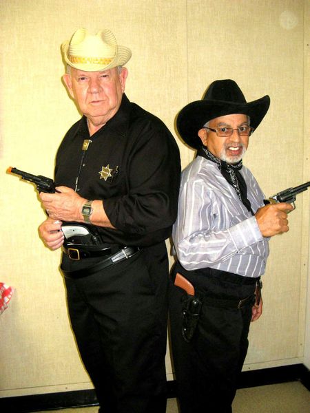 Shoot-out: Lehigh Acres Senior Center Country & Western Casino Day was interrupted by an old fashioned fight by gun slingers, left to right, “Marshal” Darrell Fratzke and outlaw Freddie “Billy The Kid” Bonilla who made the ultimate sacrifice for all the bandits. Photo by Joanie Ferster