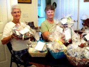 Craft Fair: Betty Nottling, shown on right, is general chairman and Margaret Switzer, the co-chairman, are showing some of the more than 30 baskets that will be featured as part of a silent auction on Saturday, December 4 from 9 a.m. to 1 p.m. at the First Community Congregational Church, located at 200 Leeland Heights Blvd. The Christmas bazaar craft fair will have something for everyone, including a food sale homemade candy, door prizes and craft tables (available at $20 – please call the church office at 239-369-1615 to reserve a table).