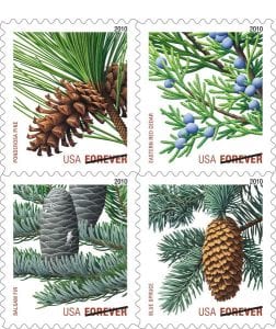 This year, the stamps sell for 44 cents. Appropriately, the stamps picture needles, cones and berries of evergreen trees, symbolizing the evergreen nature of their postal value.