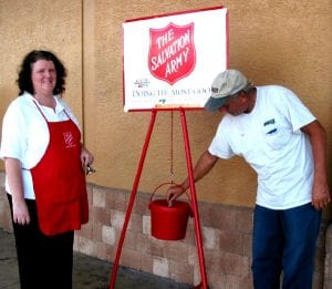 Salvation Army Christmas collections: Andrea Lucha of Lehigh Acres is one of the workers in Lehigh who has been hired by the Salvation Army to ring the bell hoping people will contribute to the Salvation Army which helps the less fortunate especially during the holiday season. Paul Fletcher, of Lehigh, is at right and stopped by to offer a donation. Lucha was set up in front of Jack’s Market on Homestead Rd. She said the kettle moves from the front of different stores in the community. Photo by Mel Toadvine