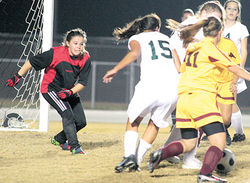 Island Coast goalkeeper Hayley Hood keeps her eyes on the ball rattling around in a crowd in front of the net after a corner kick by the Riverdale Raiders Monday night. More photos are available online at: cu.cape-coral-daily-breeze.com. Photo by Michael Pistella
