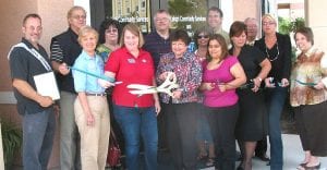 Community Services ribbon cutting: Lehigh Acres Community Services and the Lehigh Acres Chamber of Commerce held a joint ribbon cutting last week celebrating the new location for Lehigh Acres Community Services at 201 Plaza Drive. The agency provides help for the needy in Lehigh. Shown at the ribbon cutting was Charlotte Rae Nicely, center, holding the king-sized pair of scissors. At left is Oscar Gamble, Lehigh’s honorary mayor who read a proclamation marking the event. Also in photo are Megan Greeley-Gibson, Child Care of Southwest Fla.; Helen Endres, a member of the Chamber’s ambassador’s committee; Toni Roy, Omni Home Care; Sue Thompson, Chamber ambassador, Rosanna Alvarado, the agency’s administrative assistant, Cindy Dodd, Reliance Bank; Mike Swords, SDS Accounting; Edd Weiner, Lehigh architect, Cheryl McConahy, the agency’s assistant director, and Joe Whalen, president and CEO of the Chamber, shown in the back row. Photo by Mel Toadvine