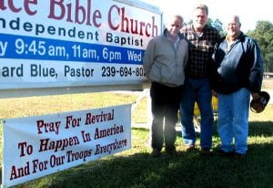 Buckingham Rd. Shown here is the name of the church is a banner encouraging everyone to pray for America at noon each day of the week. Their church will open Monday, Feb. 7 at noon for such an occasion with no sermons or preaching. The men shown are Church Deacon J. Sessions, John Goldsberry and Tom Giddings. Photo by Mel Toadvine