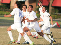 Photos MICHAEL PISTELLA Cape Coral’s Kevin Hurley (second from left), Olivier Benedict, Caio Amaral, and Paolo Acosta celebrate their first goal scored by Kevin Lopera (10) in the state semifinals win Thursday. The Seahawks (24-1-3) play for the school’s first team state championship at 2 p.m. today in Tampa. More photos are available online at: cu.cape-coral-daily-breeze.com.
