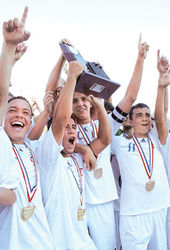 PhotosMICHAEL PISTELLA Juan David Cano, Paolo Acosta, Andrew Gonzalez and Nathan Stone celebrate with teammates after winning Cape Coral’s first high school state championship Saturday in Tampa. More photos are available online at: cu.cape-coral-daily-breeze.com.