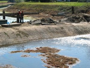 Water is beinig lowered in the Able Canal at the dead end of Maple Ave., just off E. Third St. To the bottom right, you can see where water is entering the east side of the canal causing the canal upstream to drop three feet which have brought calls the the East County Water Control District. Critical weir work is being done at the site and the water lowering had to be done, workers on the scene said Tuesday. Photo by Mel Toadvine