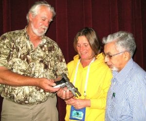 Lehigh Acres Senior Center Lunch Bunch, featured certified firearms instructor Allan Whitman, left, are shown here with students, Catherine Rainvilla and Freddie Bonilla. The free seminar, “Introduction to Fire Arms,” included safety, types of guns, proper grip, stance, follow through, maintenance, firearm games, reading list, trigger and breath control. The February 7 class was the beginning of a journey toward self-defense and a new hobby option. Those over 50 are invited to stop by the Center on Plaza Drive, pick up your free list of more than 55 weekly activities or special events and start some new adventures of your own. Photo by Joni Ferster
