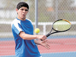 MICHAEL PISTELLA Cape Coral sophomore Gerardo Carrizo hits a backhand during his match against Mariner’s Steve Allen Tuesday. More photos are available online at: cu.cape-coral-daily-breeze.com.