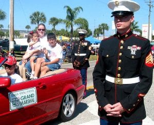 Jennifer Amores and her two children, Kolby and Violet were parade marshals of the Lehigh Acres Spring Festival Parade Saturday. Shown are several U.S. Marines who accompanied the car as it drove in the parade. To see or buy this photo and others, go to: cu.lehighacrescitizen.com