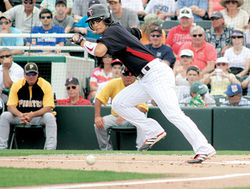 Minnesota second baseman Tsuyoshi Nishioka heads to first base as his bunt hugs the third-base foul line in the first inning Monday against the Pittsburgh Pirates. More photos are available online at: cu.cape-coral-daily-breeze.com. Photo by Michael Pistella