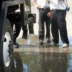 Israeli firefighters on equipment: Lehigh Firefigher and Paramedic Jay Debow, left, shows two Israeli firefighters some of the equipment at the fire station on Homestead Rd. last week. Photo by Mel Toadvine