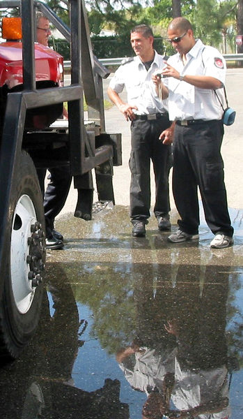 - Reflections of firefighters: Two Israeli firefighters spend a day in Lehigh last week visiting fire stations and looking at equipment plus being given a tour of the brush areas of Lehigh that are dry. The men are talking to Chief Don Adams, partially shown at left. Photo by Mel Toadvine