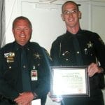 Officer of the Month: Lt. James Loethen, second in command at the Brava District Sheriff’s Substation, left, told the chamber audience why Detective Daniel Bray, right, was honored. Photo by Mel Toadvine