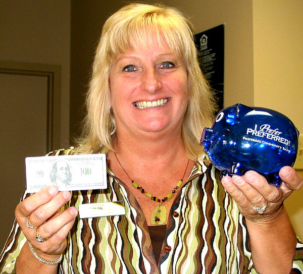 - Gifts given to first graders: Laurie Jerriey, local banker, shows the gifts given to students at Sunshine Elementary School. Each got a piggy bank from Premier Community Bank and a “squeegee,” showing what a $100 bill looks like. Photos by Mel Toadvine