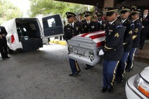 Photo by DAVID ALBERS The casket carrying the body of Army Sgt. Linda L. Pierre is removed from First Baptist Church in Immokalee Saturdaymorning. Pierre, 28, was killed in Afghanistan earlier this month.