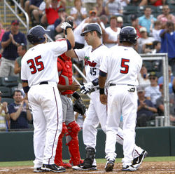 Minnesota Twins catcher Joe Mauer (45), on rehab assignment in Fort Myers, crosses the plate after belting a three-run home run and greeted by Miracle teammates Daniel Rams (35) and Aaron Hicks (5) Friday night at Hammond Stadium. Photo by David Morency