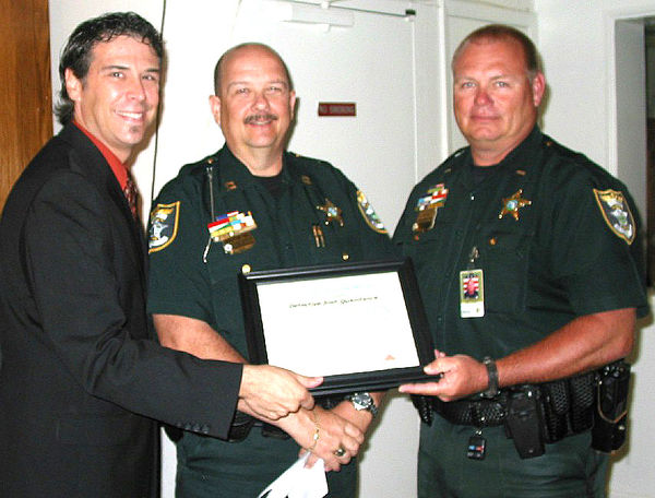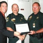 Officer of the Month. Lt. James Loethen, right, accepts an award from Joe Whalen, left, president and CEO of the Lehigh Acres Chamber of Commerce. The award was for Detective Josh Quaintance, who was unable to attend. In the center is Capt. Ronald Curtis, who told chamber members how Quaintance had brought about the arrest of a suspect charged with the theft of coils from several air conditioning units at Lehigh businesses. Photo by Mel Toadvine