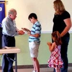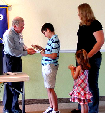 Amores Honored as Hero: Kiwanis President Richard St. Dennis awards a plaque to Korbin Amores as his mother, Jennifer and his sister, Violet Amores look on. Korbin and Violet are children of slain Marine Sgt. Jason Amores, of Lehigh Acres, who was killed in January in Afghanistan. Jennifer is Amores’ widow. The award was presented to Korbin in honor of his father. Kiwanis Club photo