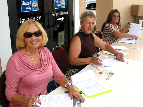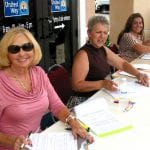 - From left, Doris Moore, a staffer with Lehigh Community Services, Dawn Ziegler with the Dr. Piper for Social Services agency and Claudia Tellez, with Lehigh Community Services, check people off who have registered to receive free food in Lehigh. Photo by Mel Toadvine