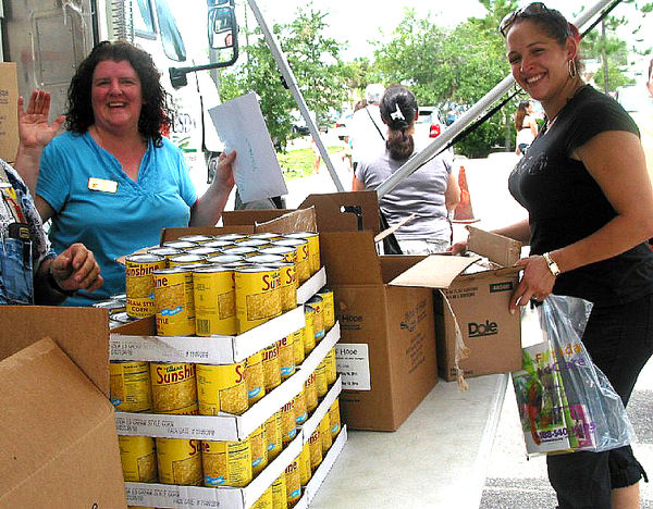 Elizabeth Sanchez and Yasnmea Pino are shown at the Lehigh Acres mobile pantry drive last week in Lehigh Acres. Nearly 1,000 people came to receive food. Several from different agencies helped pass it out. Photo by Mel Toadvine