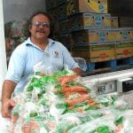 Henry Gomez hands out many large bags of carrots during last week’s food giveaway in Lehigh.