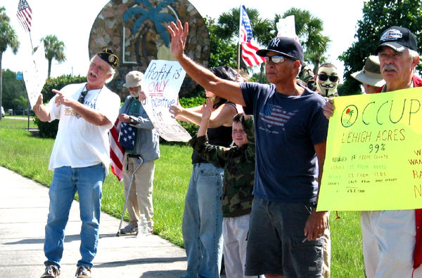 The Occupy Lehigh assembly was held on the pavement near the grassy area at the Welcome to Lehigh Acres Sign.
