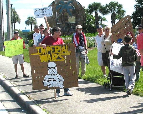 “Know what that means,” asked Lee Weng of Lehigh who was holding the sign. “It means we are being ruled by the wealthy.”
