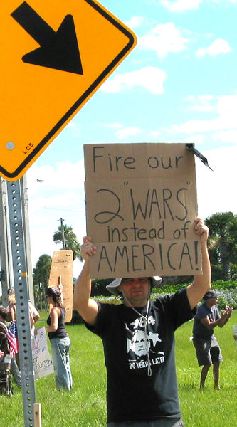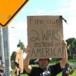 Broderson carried a sign against the “imperial wars” in Iraq, Libya, and Afghanistan.