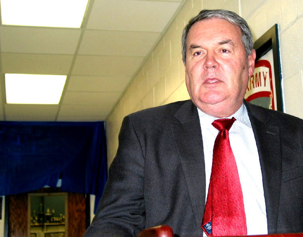 - Dr. Joseph Burke, superintendent of Lee County schools, spoke briefly at the ceremony naming the band room in honor of Sgt. Jason Amores. To his right is the sign above the door that was draped until the end of the ceremony.