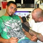 Domingo Del Tore, 24, of Lehigh, is one of Burman’s tattoo artists and he says the art is in demand today and “the girls think it is sexy” to see a guy tattooed.