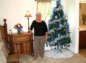 Holiday House is open for visitors: Barbara Snyder of Lehigh, who is overseeing the Christmas decorations at the Holiday House at 5006 Lee Blvd. stands in the master bedroom which has been decorated with a tree and ornaments. Even the bathroom at right is decorated. The house, past Gunnery Rd., heading west, is two doors from Lee Street. Every item in the house is being sold at a silent auction, including trees and all types of homemade Christmas decorations. The house opened Dec. 2 and will be open throughout December. It will be open again on Dec. 9 from 4 to 7:30 p.m. and then again on Dec. 10 and 11 from 1 to 6 p.m. Visitors can vote on their favorite rooms, Snyder said. Admission is free and all proceeds from the silent auctions go to the soup kitchens at First Community Congregational Church in Lehigh Acres. In addition to Snyder, professional decorators helped to make each room a holiday room. The house is a model home and is being made available by Adams Home. MEL TOADVINE