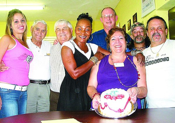MEL TOADVINE Maria Guzman holds a cake that the Kiwanis Club Thrift Store bought in her honor. From left to right are Felicia Delgado, Chuck Bergman, John Boardman, Karlene Douglas, Damon Shelor, Terry Law and Henry Gomez.