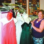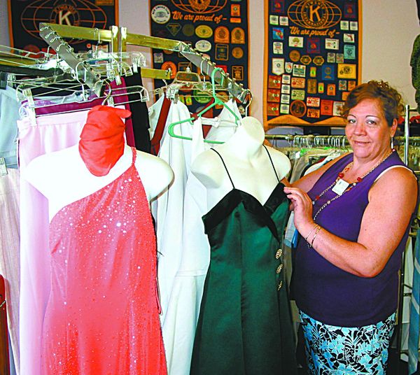 MEL TOADVINE Maria Guzman shows some of the higher end clothing at the Kiwanis Thrift Store. Many of the clothes still have original price tags on them and are selling for only a few dollars.