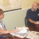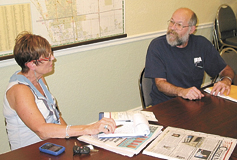 MEL TOADVINE Mike Lauer, right, a resident of Lehigh, discusses problems obtaining narcotic pain relieving medication due to a crackdown by the state on illegal pill mills. He met with Diana McGee, a representative for U.S. Sen. Bill Nelson last week. She was in Lehigh to meet with people who are having problems that perhaps the federal government can help.