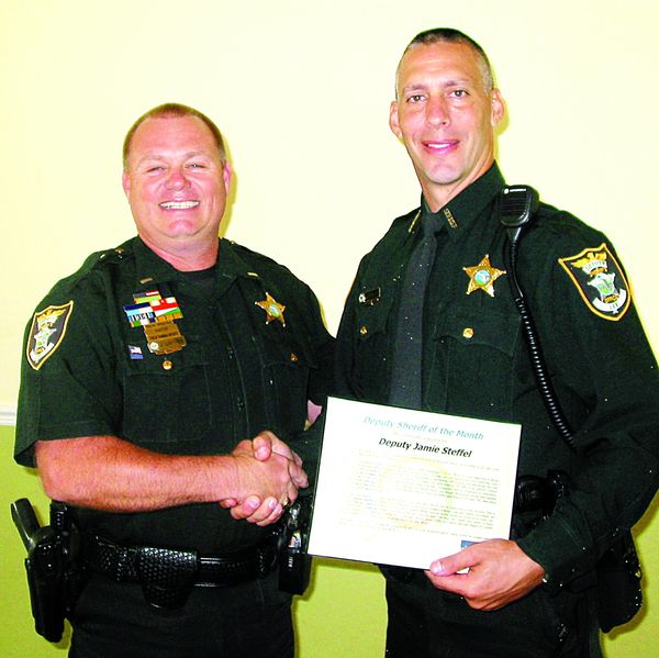 MEL TOADVINE Lt. James Loethen of the Bravo Substation of the Lee County Sheriff’s Office, left, presents the Deputy of the Month Award to Deputy Jamie Steffel for his part in saving the life of an individual in Lehigh.