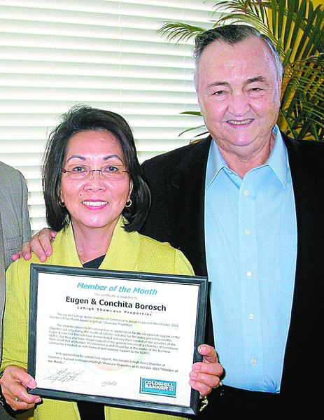 He said the chamber was honoring Mr. and Mrs. Borosch, owners of Lehigh Showcase Properties at their shopping center where the chamber offices are located. Bright said the husband and wife team were honored for the many preceding months of exceptional support for the chamber.