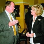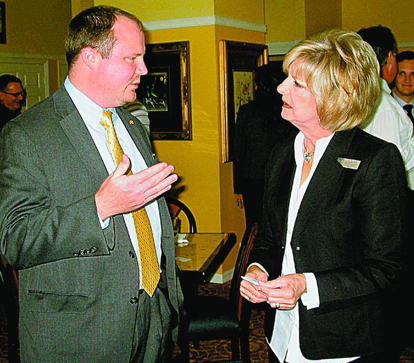 MEL TOADVINE Rep. Matt Caldwell of Lehigh speaks with Theresa Goodlad, a local insurance executive that bears her name. The two talked at last week’s chamber luncheon.