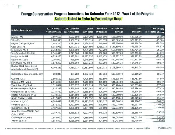 - Energy conservation recorded by the Lee County Schools for 2012.