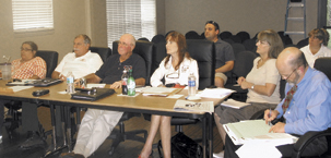 MEL TOADVINE Members of the board of commissioners held a public workshop concerning the employment of a future fire chief of the Lehigh Acres Fire Dept. The members are from left to right, Linda Carter, David Adams, Larry Becker, Jackie Danis and Cathy Kruse. Board attorney Richard Pringle is at right.