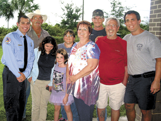 MEL TOADVINE Gary Kruse, left, and Mike Picciano, members of the Lehigh Acres Fire and Rescue Department, were honored at last week’s meeting at the Lehigh Fire District for their efforts in saving a life. The family involved are shown here from left to right after Kruse, Billy Sparks, Sarah Sparks, Jorja Sparks, Jennifer Sparks, Dana DeMartino, Chris Sparks (the patient), Augie DeMartino and Picciano. The family sent a letter to Capt. Martin McDowell, the fire district’s training officer citing the efforts of Kruse and Picciano.